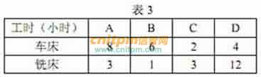 某车间需要用一台车床和一台铣床加工A、B、C、D四个零件。每个零件都需要先用车床加工,再用铣床加工。车床与铣床加工每个零件所需的工时(包括加工前的准备时间以及加工后的处理时间)如表3。