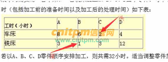 若以A、B、C、D零件顺序安排加工,则共需32小时。适当调整零件加工顺序,可产生不同实施方案,我们称可使所需总工时最短的方案为最优方案。在最优方案中,零件A在车床上的加工顺序安排在第 (1) 位,四个零件加工共需 (2) 小时。