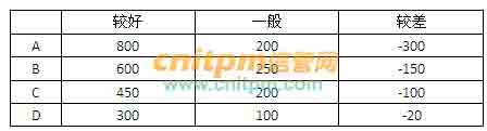 某企业要投产一种新产品,生产方案有四个:A新建全自动生产线;B新建半自动生产线;C购置旧生产设备;D外包加工生产。未来该产品的销售前景估计为较好、一般和较差三种,不同情况下该产品的收益值如下:(单位:百万元)