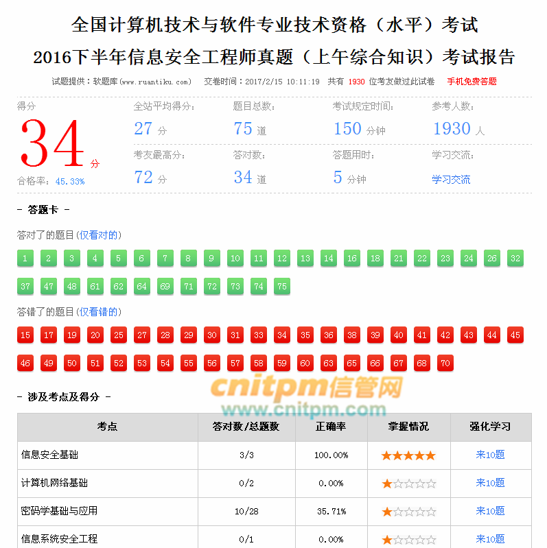 软题库(www.ruantiku.com)计算机技术与软件考试中级信息安全工程师智能答题考试系统于今日上线运行,软题库信息安全工程师智能答题考试系统提供了信息安全工程师综合每日一练、综合智能练习、知识分类章节练习、历年真题模考、全真模拟试卷、月底摸底考试、综合考前密卷、案例分析每日一练、案例综合练习、案例分类章节练习、案例真题模考等在线答题服务。