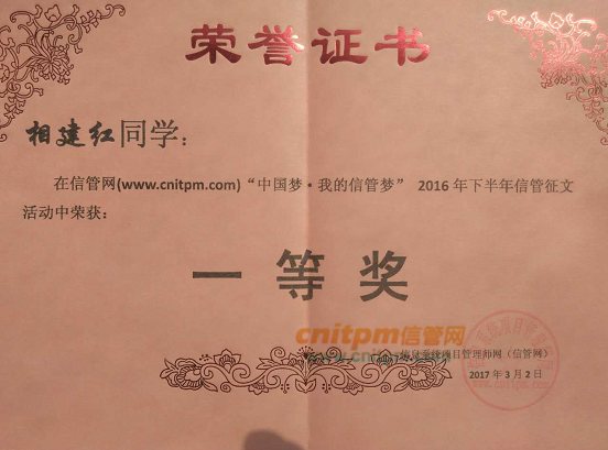软考是一项持久战,希望师弟师妹们把它就当做是一项信息系统项目来管理, 当做一项真实的案例来实践,全面应用软考知识,尤其做好时间管理,理论联系实践,争取一次通过。按历史规律统计,就三门考试难易程度来说,最容易的是“综合知识”,这门考试不通过,基本上说明考友没有认真复习,其次是“案例分析”,最难的是“论文写作”。但近几年越多越多的考友最后却挂在了“案例分析”上,就其原因是出在计算机题上。以上就是我对软考中高项考试的一些经验教训总结分享,由于篇幅有限,无法一一详述。当然我今年一次性通过中项和高项,并且只复习了两个月,我是幸运的,在这儿要特别感谢我爱人的大力支持,每每复习到夜深人静备感疲倦时,谢谢你给我沏茶倒水。我觉得通过考试不是考试的主要目的,要切实把学到的理论知识应用在工作实践当中,全面提高项目管理能力,为国家、社会、公司和家庭带来应有的回报。