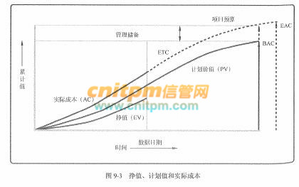 对计划值、挣值和实际成本这3个参数,既可以分阶段(通常以周或月为单位)进行监测和报告,也可以针对累计值进行监测和报告。图9-3以S曲线展示某个项目的EV数据,该项目预算超支且进度落后。