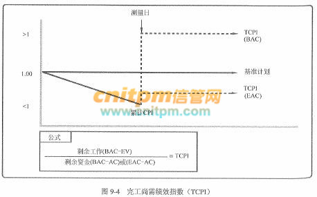 TCPI的概念可用图9-4表示。其计算公式在图的左下角,用剩余工作(BAC减去EV)除以剩余资金(可以是IBAC减去AC,或EAC减去AC)。