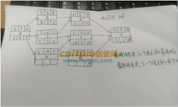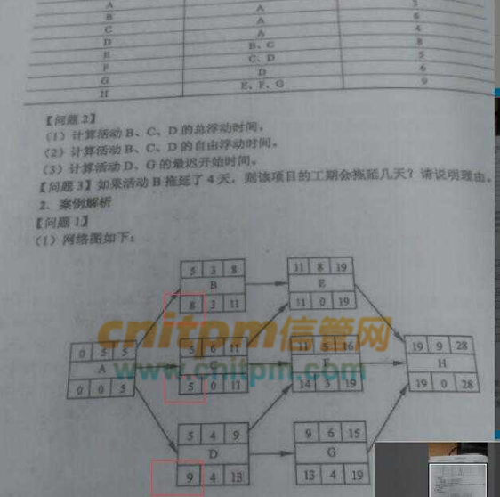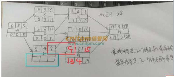 D有2个输出,分别是F和G,13比14小,所以d的最迟结束时间为13,减去持续时间4,D的最迟开始时间为9,总是差4,也就是绿框里的数据是9,4,13