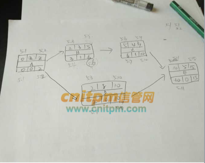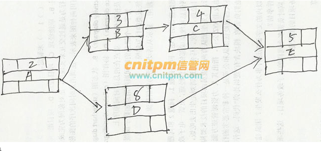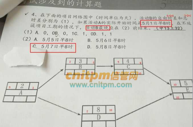 在下面的项目网络图中(时间单位为天),活动B的自由时差和总时差分别为(1),如果活动A的实际开始时间是5月1日早8时,在不延误项目工期的情况下,活动B最晚应在(2)前结束
