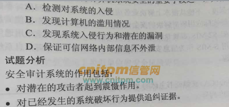 还是得看教材 教材上说为系统安全管理员提供有何时何地的系统使用日志,从而帮助系统安全管理员及时发现系统入侵行为…… 使用日志可以看出计算机有没有被滥用 但是不能看出网络内部信息有没有被泄露