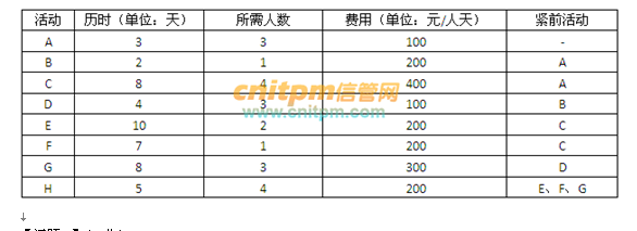 已知某信息工程由A、B、C、D、E、F、G、H八个活动构成,项目的活动历时,活动所需人数、费用及活动逻辑关系如下表所示
