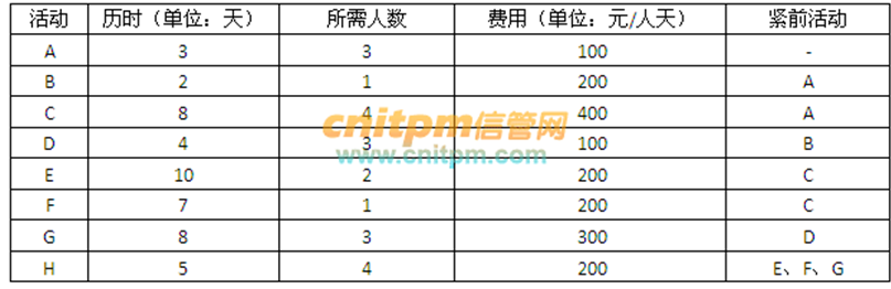已知某信息工程由A、B、C、D、E、F、G、H八个活动构成,项目的活动历时,活动所需人数、费用及活动逻辑关系如下表所示