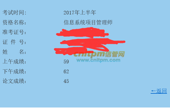 先自我介绍一下本人情况,本人04年本科毕业,毕业后一直从事it行业,从程序员、研发工程师、dba、系统架构师干到现在的项目管理岗位。在从事项目管理的岗位中,与外单人接触越来越多,经常提到的风险管理、质量管理,但是相关的概念及知识,我却不是很了解,后就准备参加软考中的信息系统项目管理师,2013年下半年第一次以裸考的形式参加考试,成绩有点惨不忍睹,只有上午综合过了,之后由于工作繁忙的原因就没有继续参加考试,直到15年的时候,这一年工作不是很忙,心里就又琢磨这个软考的事,报名了15年下半年的考试,然后又拿起书本,随意的看看了,结果今年我爱人怀孕,没有太多时间去看书,考试结果也是一直预料之中,转眼到了16年,虽然也安慰自己,以考代学,虽然没通过考试,但是自己管理知识和水平还是有了很大的提供,在实际工作中,把学到理论用于指导实践,如沟通方法以及有效沟通升级原则,如平级无法解决的问题,找对方的领导,问题还无法解决,把问题想自己的领导和对方的领导协调等,但是心中多少还是有点遗憾,毕竟拿到证书对自己学习结果的认可,对自己来说也是一个里程碑。转眼时间到了16年,为了提高学习效率(毕竟自己有两个娃),我购买了JRS直播的软题库,考完试也是信心满满,综合和案例应该没问题,但是论文不确定,结果成绩出来时,果然如我所料,论文挂了,一直以为自己有10余年的项目实践经验,论文写起来应该问题不大,看样还是高估了自己,考试实际写下来还是很累的,每次都是现场发挥,写完都不记得自己写的啥了,痛定斯通,还是要按套路出牌,这次我成热打铁了,又报名了17年上半年的考试,这次我重点准备论文,考前自己手写5篇论文,锻炼写字速度,以及字迹的工整程度,写完让老婆读一遍,字是否都认识,7月10号,成绩出来时,查询结果下: