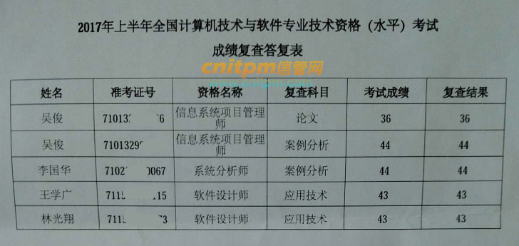 2017年上半年江苏省共有5位考生提出了成绩复查申请,包括2名信息系统项目管理师考生和3名系统分析师考生,经过复查,成绩无误,具体通知如下:
