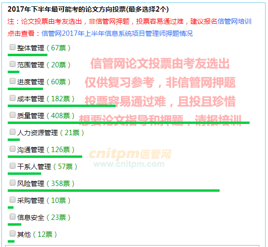 经过JRS直播考友一个多月的投票,2017年下半年信息系统项目管理师论文投票今日截止(截止时间2017年11月10日17点),以下为2017年下半年信息系统项目管理师论文投票结果截图,供各位没有报名培训的考生作为论文复习参考。