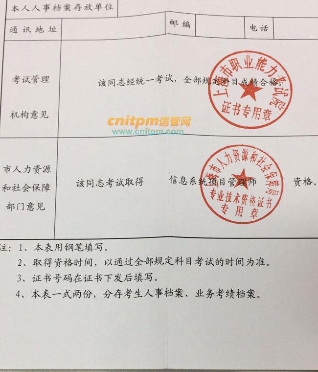 其中上海计算机技术与软件考试合格人员登记表考试管理机构意见处盖的章是“上海市职业能力考试院证书专用章”,而市人力资源和社会保障部门意见处写的是“该同志考试取得 信息系统项目管理师(你所考资格考试名称) 资格”,盖的章是“上海市人力资源和社会保障局专业技术资格证书专用章”,以下为上海信息系统项目管理师合格人员登记表样本: