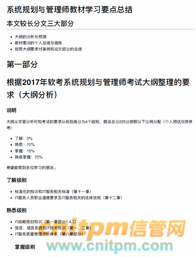 该系统规划与管理师复习资料由JRS直播学员missing@bj分享,该学员于2017年下半年通过系统规划与管理师,成绩为上午综合64分、下午案例46分、下午论文52分。