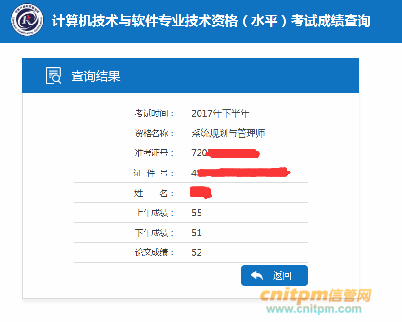 随着2017年12月21日下午下半年软考成绩发布,这几个月以来心中悬着的石头终于落下。上午成绩:55,下午成绩51,论文成绩52。觉得自己很幸运,第一次考就通过了,但又觉得这是顺理成章的事,毕竟自己认认真真地做好复习了。我始终相信天道酬勤,付出总会有回报。