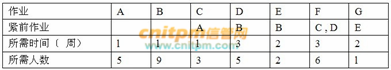 某工程包括A、B、C、D、E、F、G 七个作业,各个作业的紧前作业、所需时间、所需人数如下表: