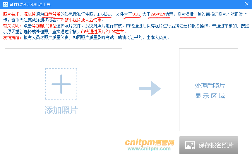 源照片须为白色背景的彩色标准证件照,JPG格式,文件大于30K,照片宽度和高度大于295*413像素(最好就等于这个数值),照片清晰,通过审核的照片才能正常上传报名系统,否则无法完成注册和报名。严禁小照片放大后使用。