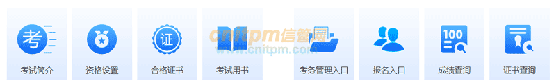 第三部分为功能区,以图标按钮形式展示考试常用功能,包含考试简介、资格设置、合格证书、考试用心、考务管理入口、报名入口、成绩查询、证书查询8个图标,点击相应图标可以进入相应功能栏目。