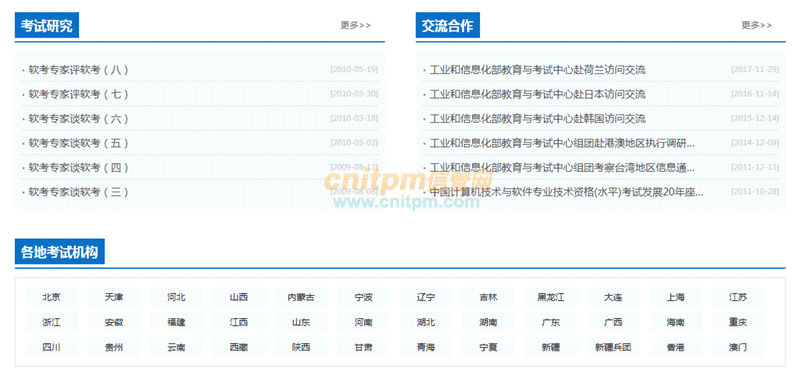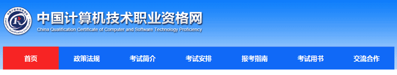 顶部栏目分为:首页、政策法规、考试简介、考试安排、报考指南、考试用书、交流合作7个栏目,点击相应栏目将显示相关内容。