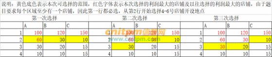 首先列出各个店铺的边际利润(fzyzx.cn),然后规则就是,在可选范围内选择能带来最大利润增加的店铺,重复这一过程直到6个店都选完,如下图,得A3B2C1。
