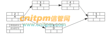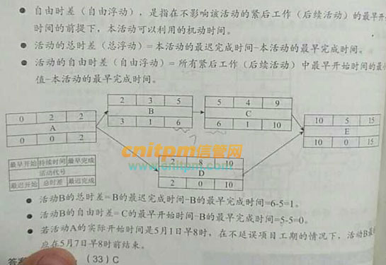 在下面的项目网络图中(时间单位为天),活动B的自由时差和总时差分别为(1),如果活动A的实际开始时间是5月1日早8时,在不延误项目工期的情况下,活动B最晚应在(2)前结束。