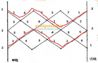 已知网络图各段路线所需费用如下图所示,图中甲线和乙线上的数字分别是对相应点的有关费用,从甲线到乙线的最小费用路线是( 1 )条,最小费用为( 2 )
