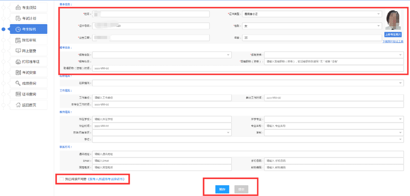 填写信息时可以进行暂存和提交,如果报名信息检查无误,首先选中我已阅读并同意《报考人员诚信考试承诺书》,然后点击提交进行信息审核,信息审核只是走一个流程,看信息是否填写正确,不涉及资格审查等工作,一般1-3个工作的审核时间。