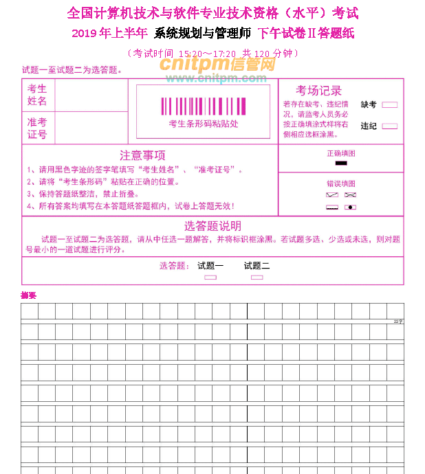 目前距离2019年上半年系统规划与管理师考试只有一个多月了,需要开始准备下午的论文科目了,为让各位考友能以考试的状态来备考论文,JRS直播特提供2019年上半年系统规划与管理师论文答题练习纸,该论文答题练习纸以系统规划与管理师论文真题答题纸为样本进行制作,大家可以下载后打印并练习。