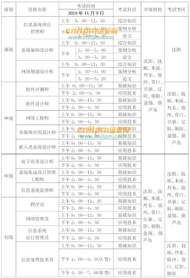 考试考区:即考生考试所在地。其中,初、中级资格除鞍山、铁岭外均设有考区,高级资格考试安排在沈阳考区。具体请参照“2019年下半年考试资格名称、时间及考区安排表”。