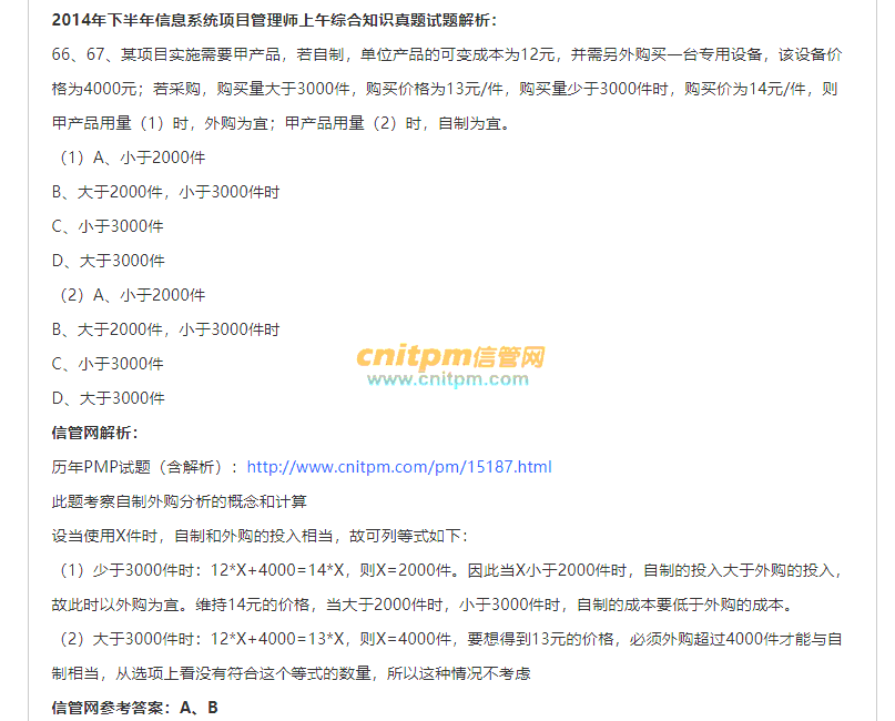 某项目实施需要甲产品,若自制,单位产品的可变成本为12元,并需另外购买一台专用设备,该设备价格为4000元;若采购,购买量大于3000件,购买价格为13元/件,购买量少于3000件时,购买价为14元/件,则甲产品用量(1)时,外购为宜;甲产品用量(2)时,自制为宜
