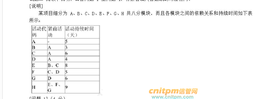 某项目细分为a、b、c、d、e、f、g、h共八个模块,而且各个模块之间的依赖关系和持续时间如下表所示