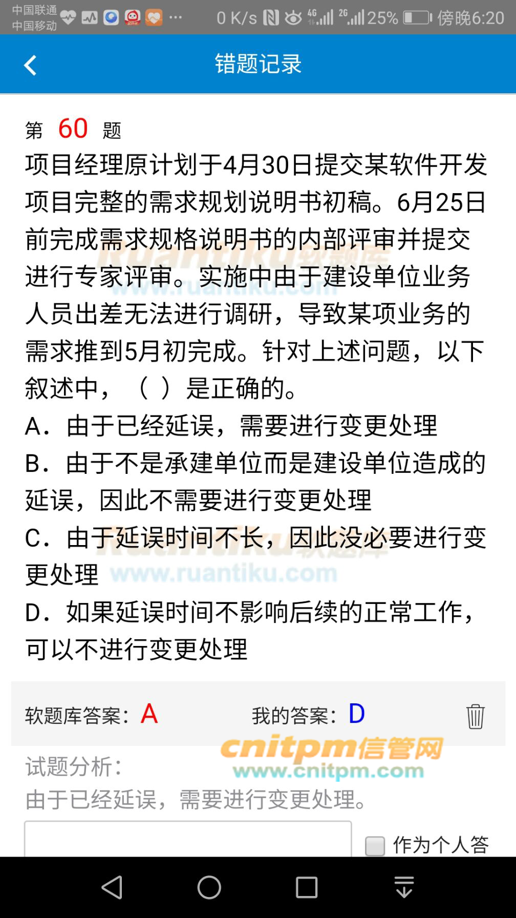 项目经理原计划于4月30日提交某软件开发项目完整的需求规划说明书初稿。6月25日前完成需求规格说明书的内部评审并提交进行专家评审。实施中由于建设单位业务人员出差无法进行调研,导致某项业务的需求推到5月初完成。针对上述问题,以下叙述中,( )是正确的。