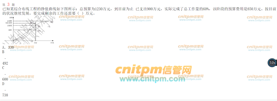 已知某综合布线工程的挣值曲线如下图所示:总预算为1230万元,到目前为止 已支出900万元,实际完成了总工作量的60%,该阶段的预算费用是850万元。按目前的状况继续发展,要完成剩余的工作还需要( )万元