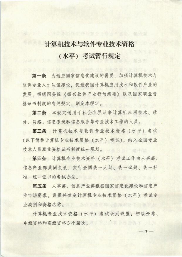 为适应国家信息化建设的需要,规范计算机技术与软件专业人才评价工作,促进计算机技术与软件专业人才队伍建设,人事部、信息产业部在总结计算机软件专业资格和水平考试实施情况的基础上,重新修订了计算机软件专业资格和水平考试有关规定。现将《计算机技术与软件专业技术资格(水平)考试暂行规定》和《计算机技术与软件专业技术资格(水平)考试实施办法》印发给你们,请遵照执行。