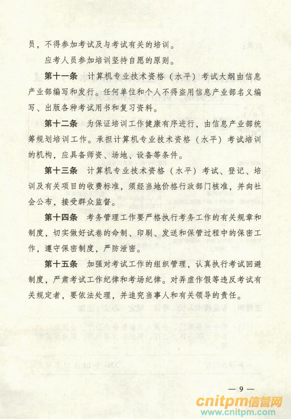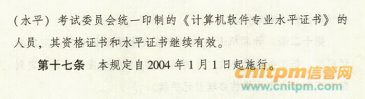 自2004年1月1日起,人事部、原国务院电子信息系统推广应用办公室发布的《关于印发〈中国计算机软件专业技术资格和水平考试暂行规定〉的通知》(人职发[1991]6号)和人事部《关于非在职人员计算机软件专业技术资格证书发放问题的通知》(人职发[1994]9号)即行废止。