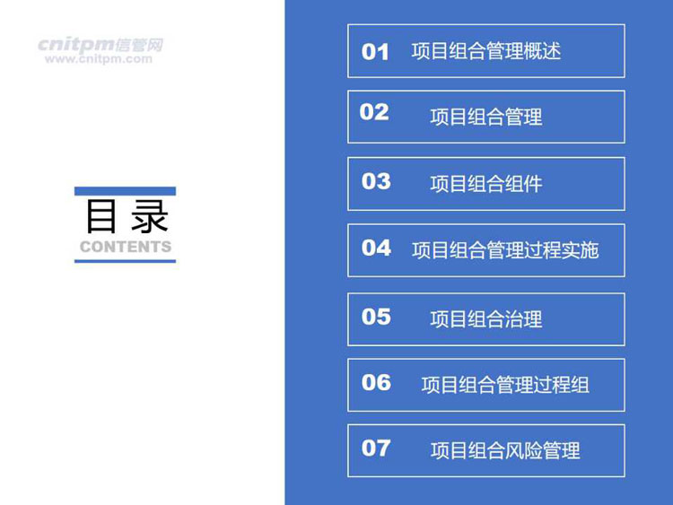 课程内容:项目组合管理概述、项目组合管理、项目组合组件、项目组合管理过程实施、项目组合治理、项目组合管理过程组、项目组合风险管理
