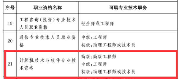 多个省市人事部门也明确发文规定了计算机软件考试高级资格对应高级职称,比如北京就明确规定计算机技术与软件专业技术资格高级对应的就是高级工程师,信息系统项目管理师作为高级资格对应的就是高级职称。原文地址:http://www.beijing.gov.cn/zhengce/zhengcefagui/201906/t20190606_87487.html