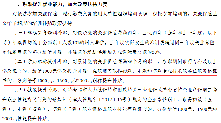 学历职称提升补贴。对累计缴纳失业保险费满36个月的职工,在职期间取得专科及以上学历证书的,给予1000元学历提升补贴;在职期间取得初级、中级和高级专业技术职务任职资格证书的,分别给予1000元、1500元和2000元职称提升补贴。
