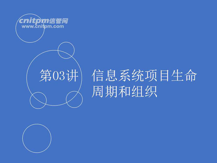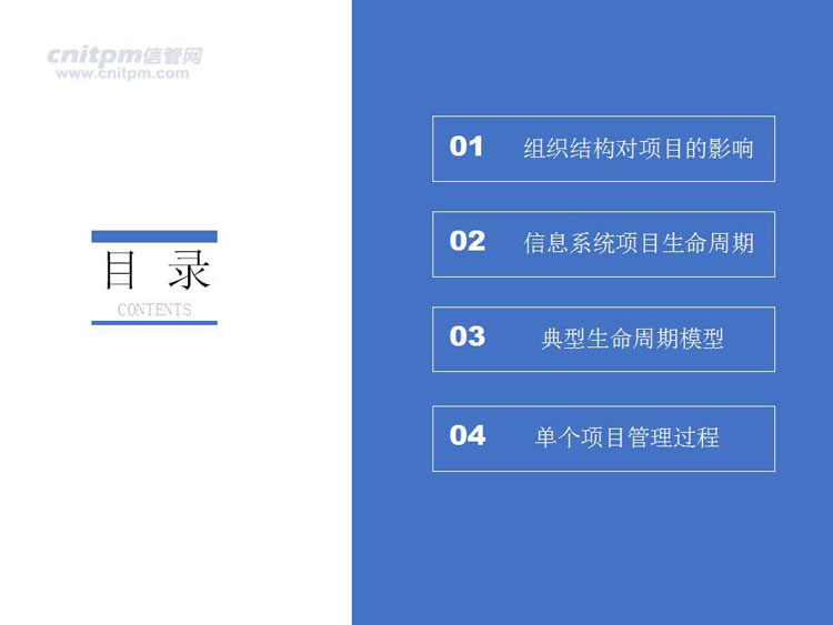 课程内容:组织结构对项目的影响、信息系统项目生命周期、典型生命周期模型、单个项目管理过程