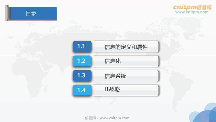 课程内容:信息的定义和属性、信息化、信息系统、it战略