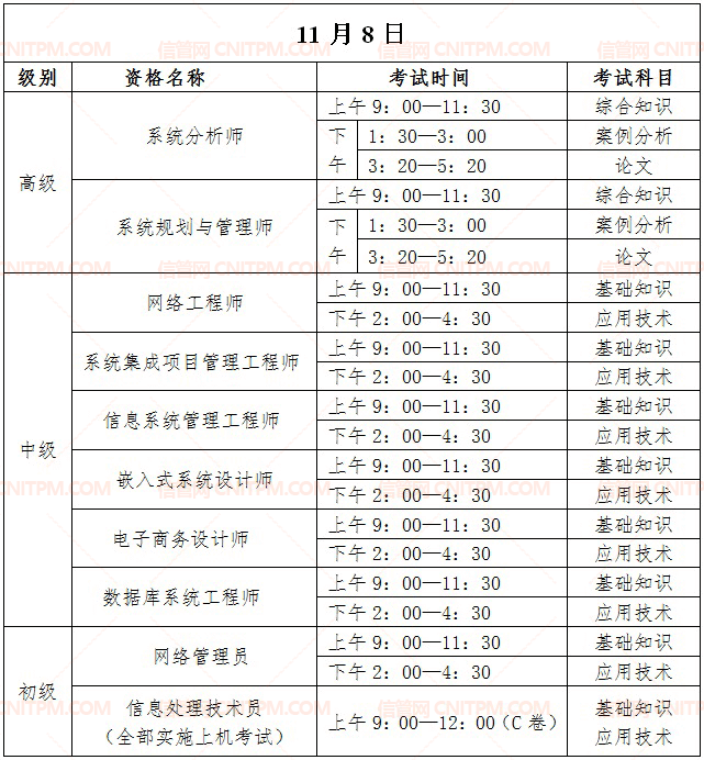 2020年软考考试时间在11月7日-8日。具体科目考试时间如下: