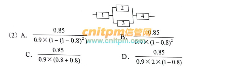 某系统的可靠性结构框图如下图所示,假设部件1、2、3的可靠度分别为0.90;0.80;0.80(部件2、3为冗余系统)若要求该系统的可靠度不小于0.85,则进行系统设计时,部件4的可靠度至少应为( )。 A. AB. BC. CD. D