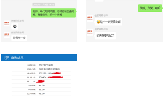 4次:2022年下半年,疫情愈发的严重,11月同期三门考试,只能有所取舍,内心笃定,疫情如此严重,考试一定不会进行,然而,考试没取消!如期举行,可是,这次,我并没有复习,考试前一天问杨老师案例公式,老师觉得,我在和她开玩笑。出考场的那一刻,我开玩笑的说:虽然是裸考,但有一线希望!哈哈,下成绩,综合差1分。