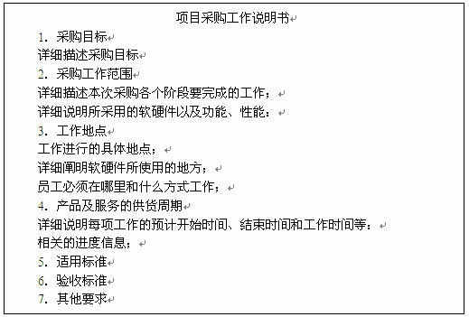 采购工作说明书描述足够的细节,以允许预期的卖方确定他们是否有提供买方所需的产品、成果或服务的能力。这些细节将随采购物的性质、买方的需要或预期的合同形式而变化。采购工作说明书描述了由卖方提供的产品、服务或者成果。采购工作说明书中的信息有规格说明书、期望的数量和质量的等级、性能数据、履约期限、工作地以及其他要求。