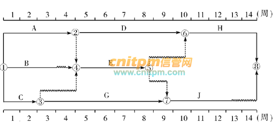 计算哪个工作的总时差,就以哪个工作为起点工作,寻找通过该工作的所有线路,然后计算各条线路的波形线的长度和,波形线长度和的最小值就是该工作的总时差。还是以上面的网络图为例,计算E工作的总时差,