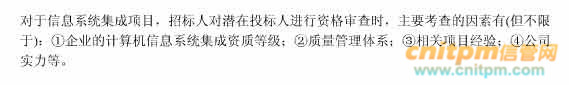 对于信息系统集成项目,招标人对潜在投标人进行资格审查时,一般会考查哪些方面的主要因素?