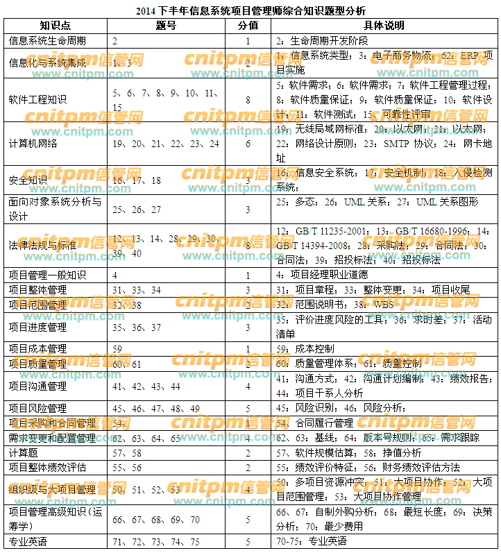 (3)、各领域知识点分数比例与2014年上半年试卷有较大变化(点击这里可以查看历年信息系统项目管理师考试题型分析),总体来看,2014下半年综合知识试题比2014上半年难度基本持平,都不是很难,注重高级人才的基础知识储备和运用能力。