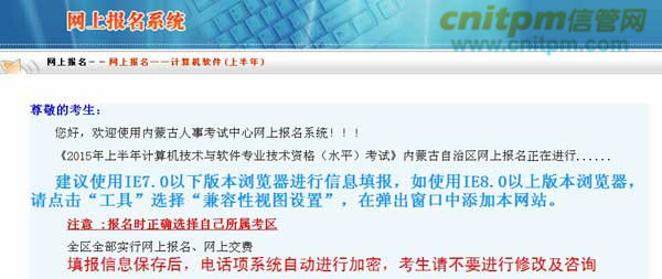 2015年上半年内蒙古软考中级系统集成项目管理工程师报名时间为:1月16日—1月26日