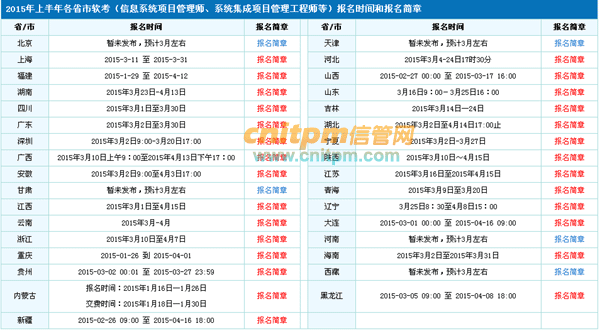 今日广西、陕西、吉林已发布2015上半年计算机技术与软件考试报名通知和简章,目前除少数省市尚未发布2015年上半年报名简章外,大部分省市都已发布2015年上半年报名简章,各位考友可以点击下面2015年软考报名专题链接查看所在省市的报名时间和方式。