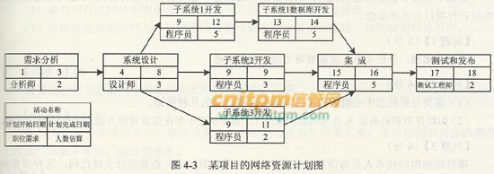 项目经理根据项目总体要求制定了某项目的网络资源计划图(图1所示,单位为日,为简化起见,不考虑节假日)并向公司申请了2名分析师负责需求分析,3名设计师负责系统设计,10名程序员负责子系统开发和集成,2名测试工程师负责系统测试和发布。项目经理估算总人力成本为27400元。