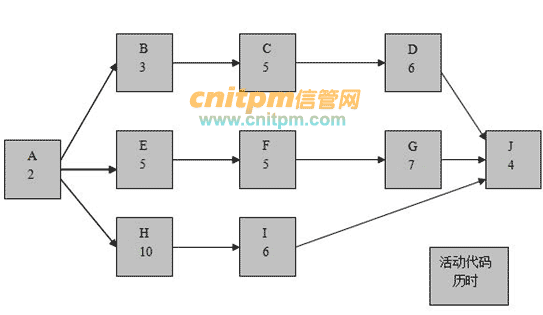 张工对该工作包进行了活动分解和活动历时估算,并绘制了如下的活动网络图。